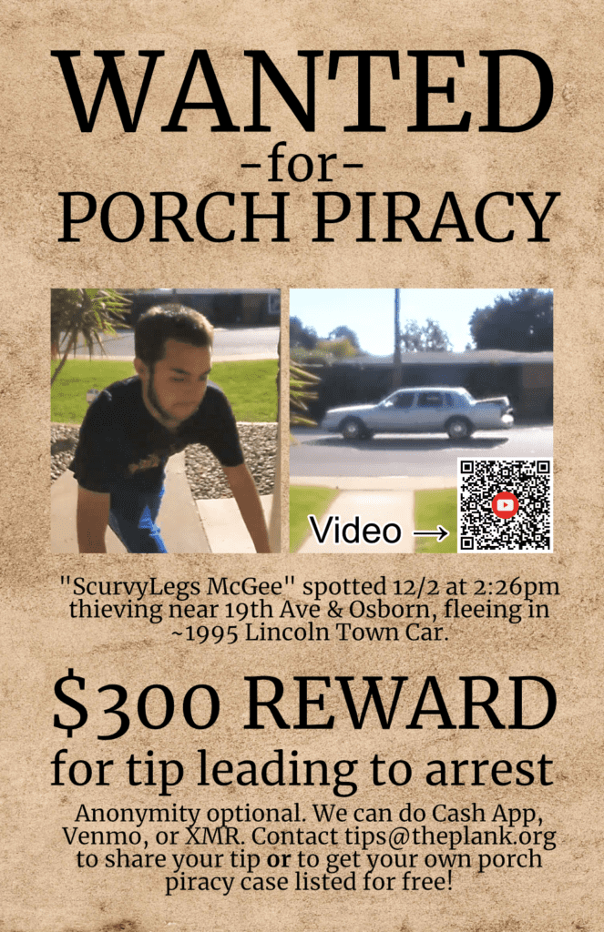 A private reward of $300 is being offered for the tip that leads to an arrest. Anonymity optional. We can do Cash App, Venmo, or XMR. Use the form below or contact tips@theplank.org to share your tip or to get your own porch piracy case listed for free!